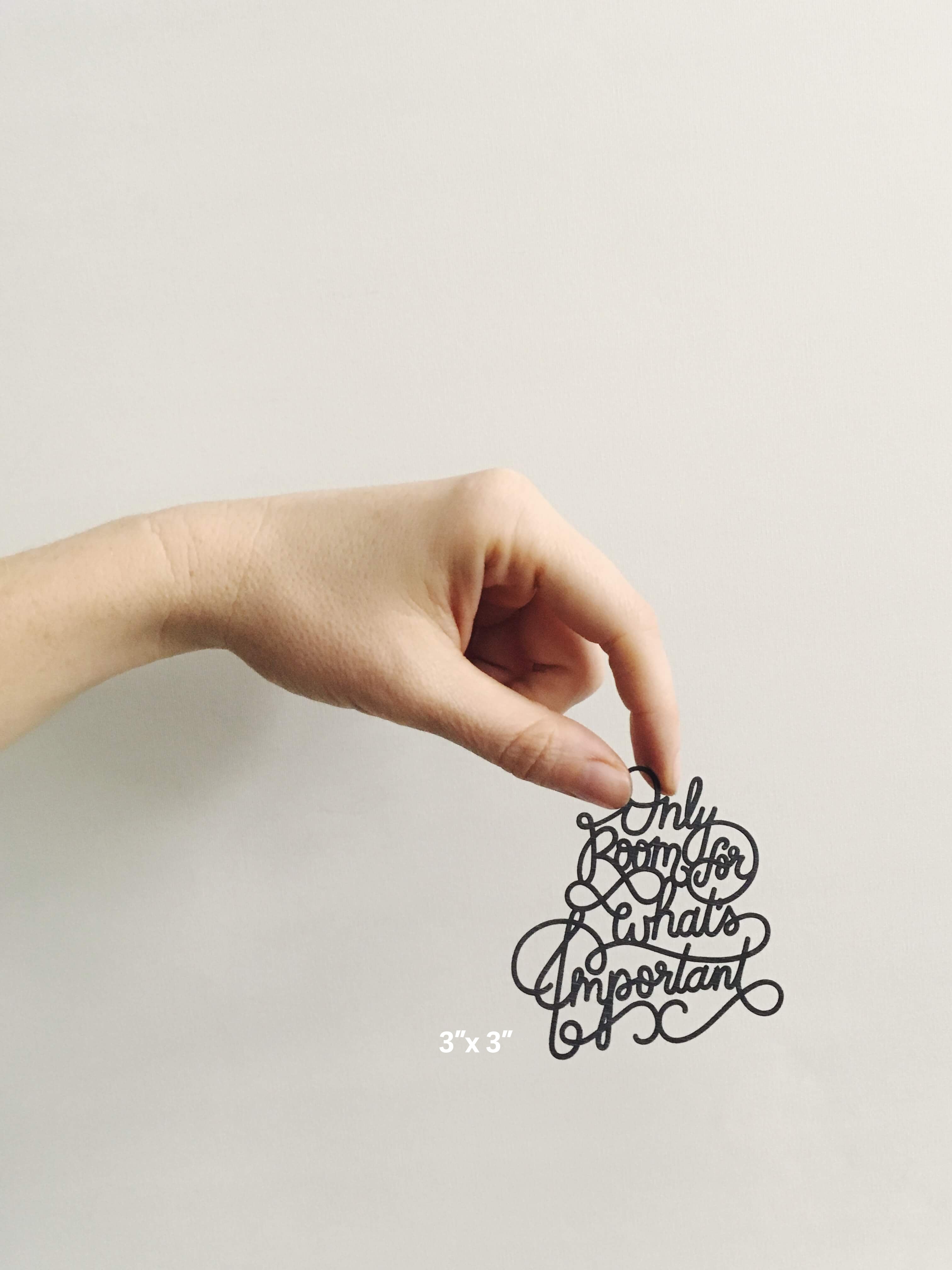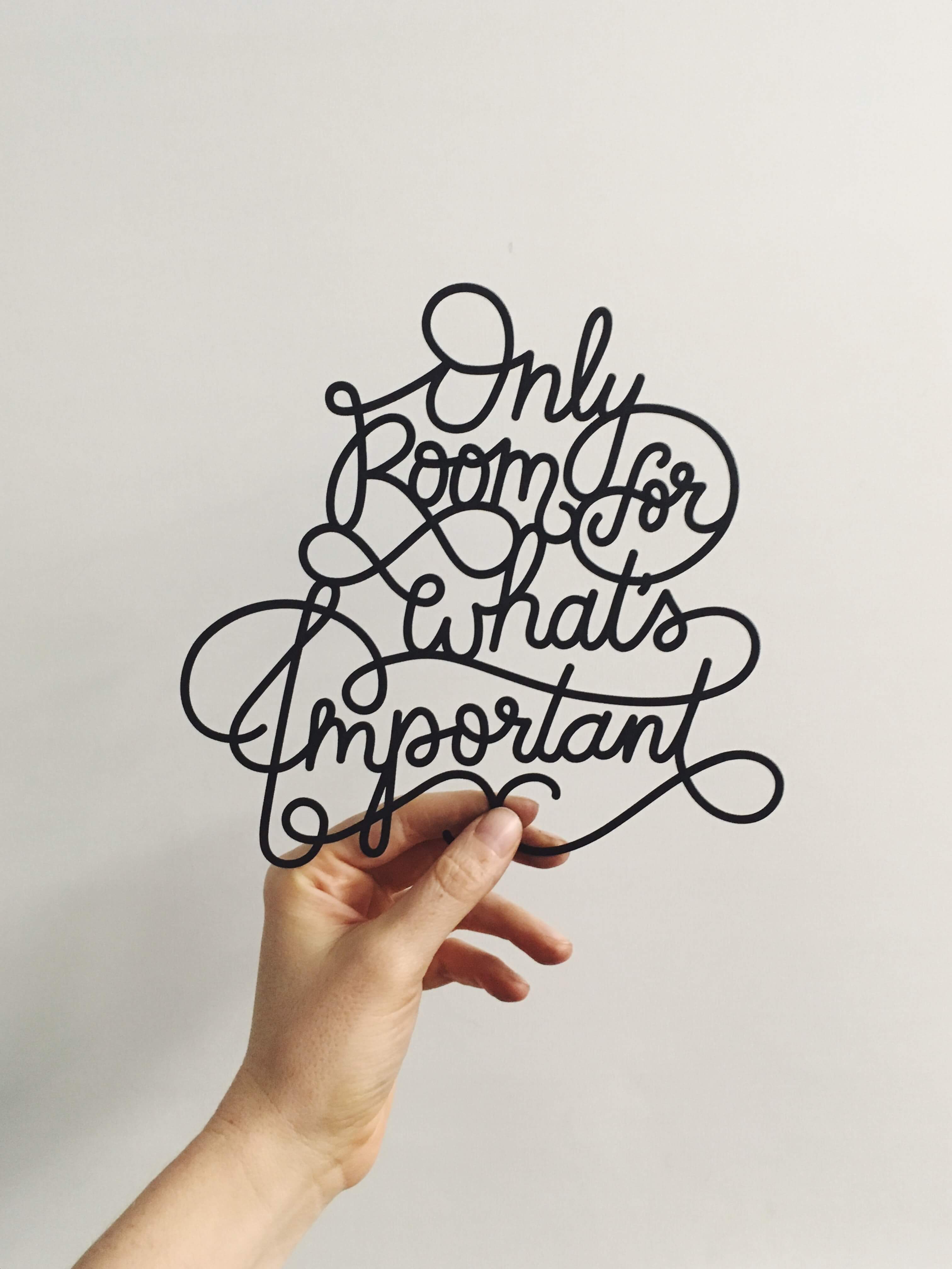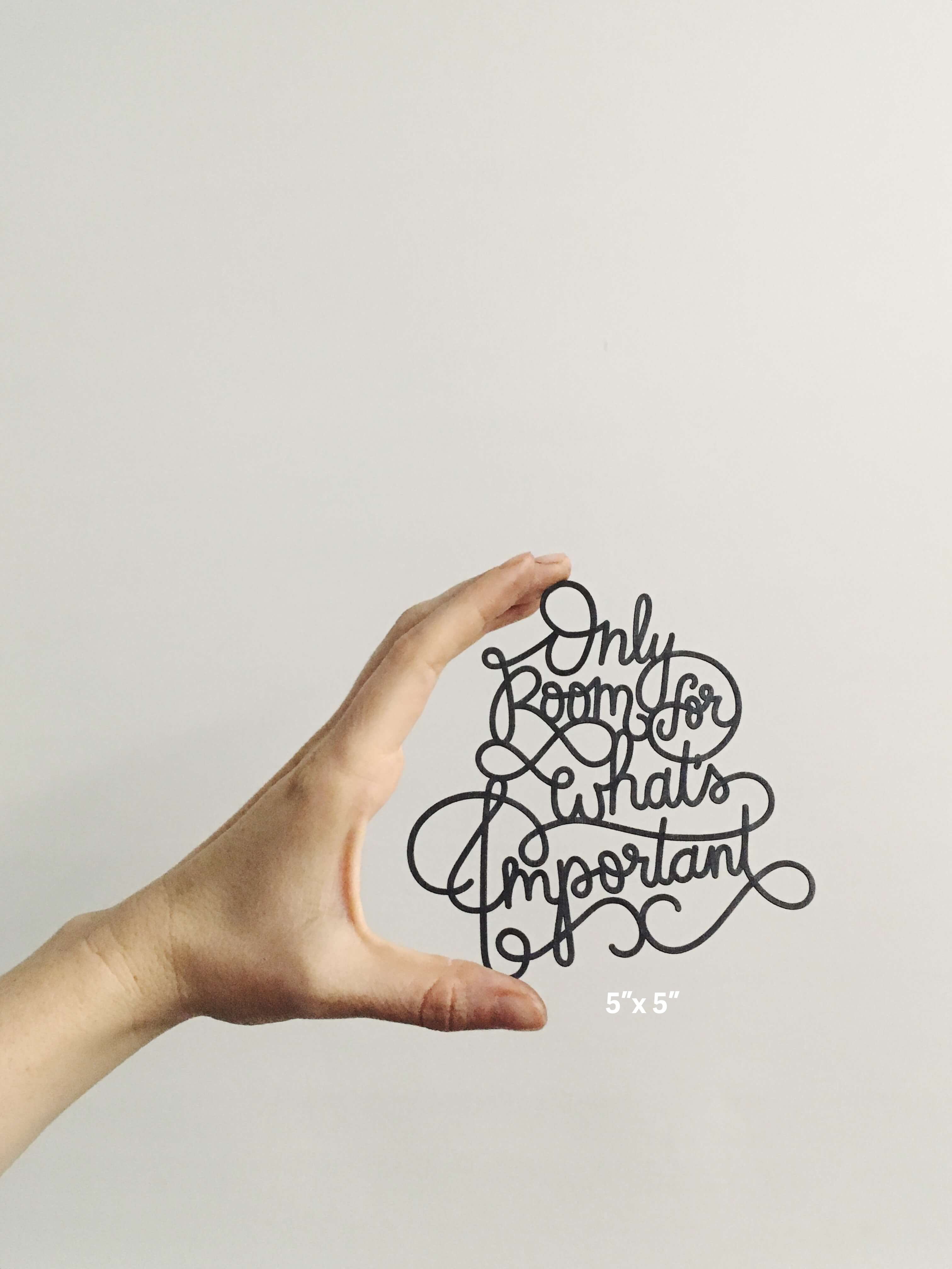 Our hand-lettered "Only Room for What's Important" design, laser cut out of thick, linen coated cardstock. We like to hang them by a single brad, and would be nice in a simple frame with just clear glass or light background for it to stand-off on.