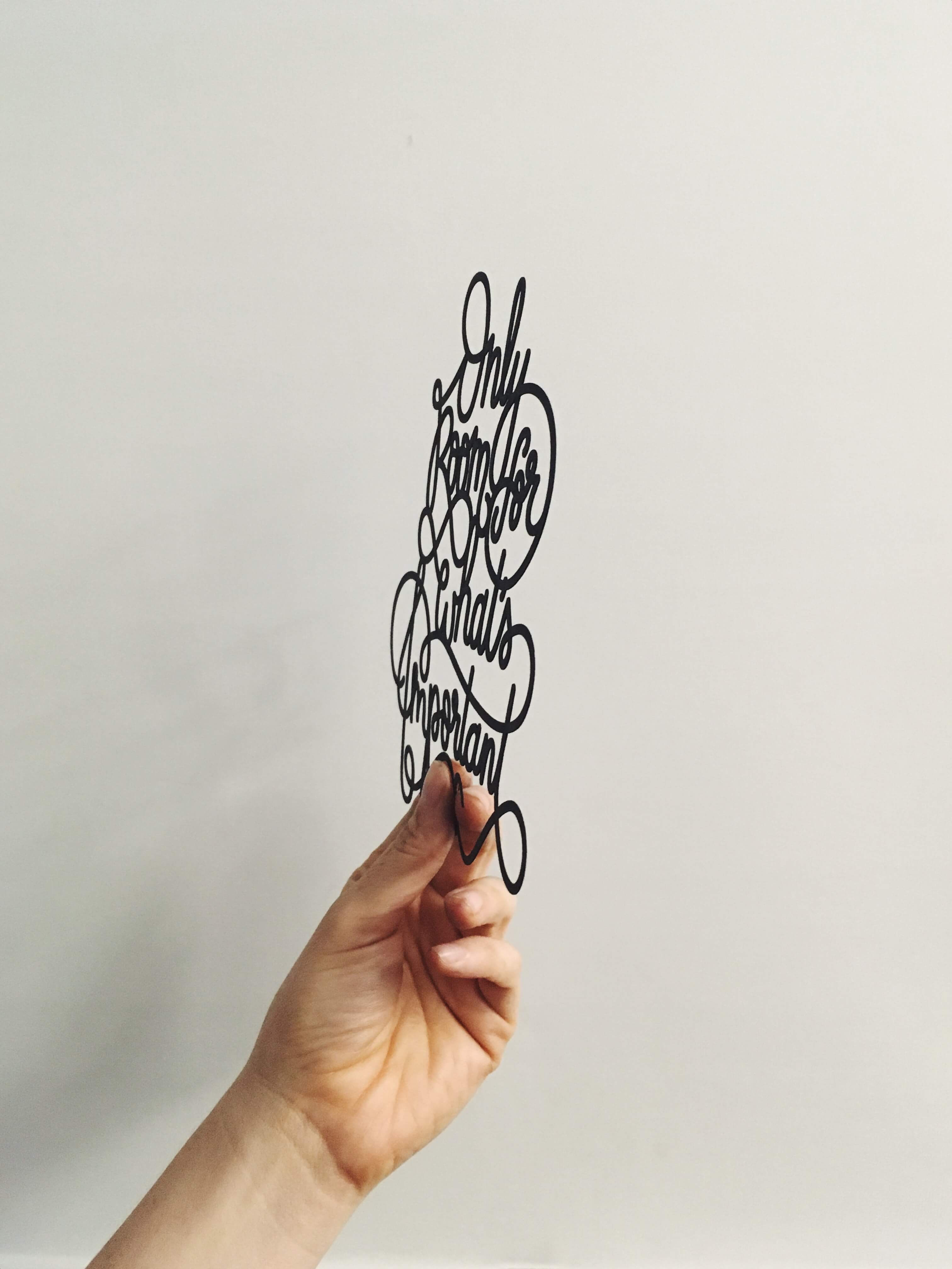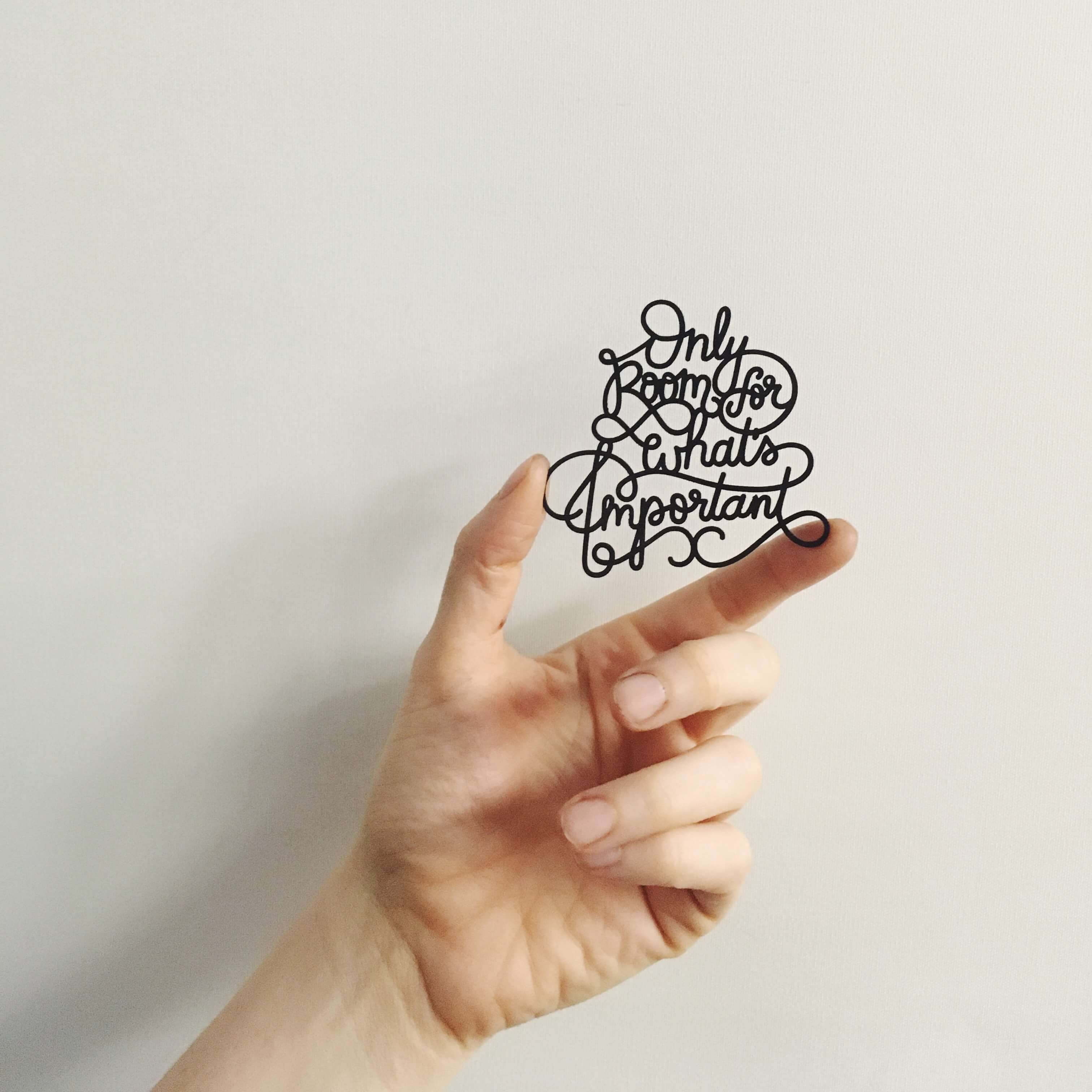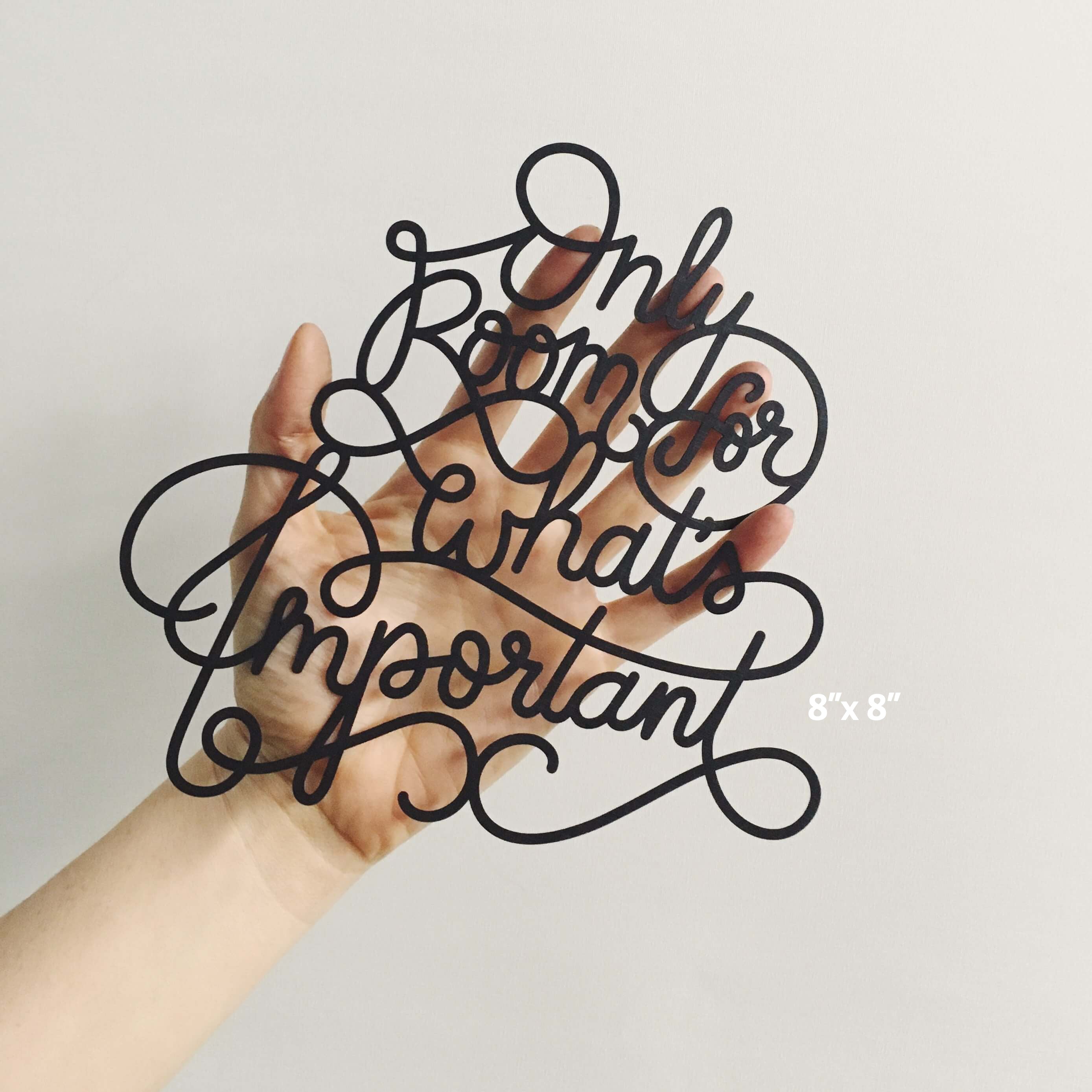 Our hand-lettered "Only Room for What's Important" design, laser cut out of thick, linen coated cardstock. We like to hang them by a single brad, and would be nice in a simple frame with just clear glass or light background for it to stand-off on.