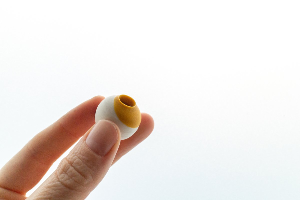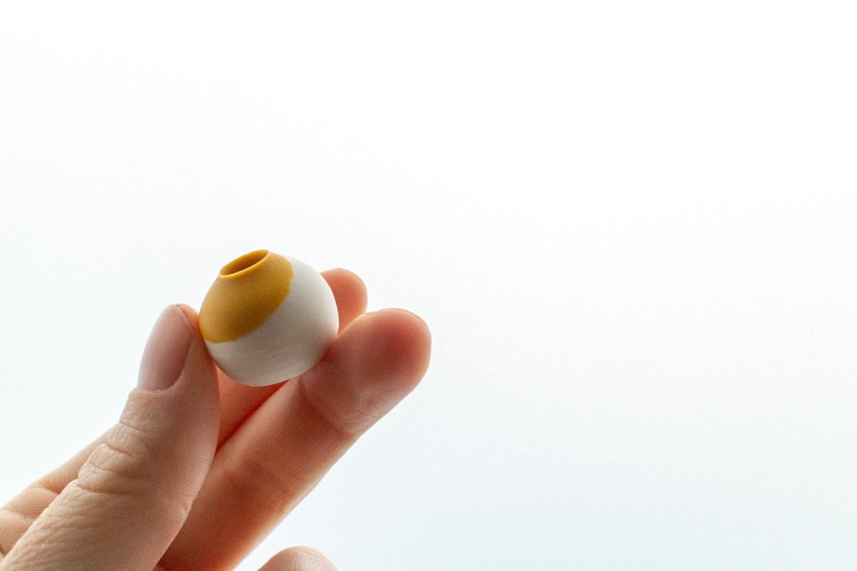 Vase with mostly unglazed white porcelain exterior. Interior and exterior around opening is accented with an angled dip of satin, mustard glaze.